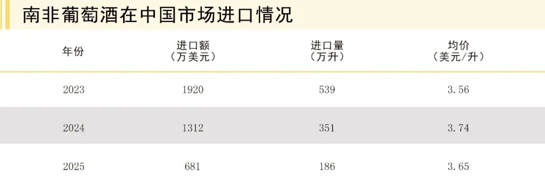中國海關總署發布的2025年全年數據顯示,南非瓶裝葡萄酒對華出口量為186萬升,出口額為681萬美元,在中國葡萄酒進口來源國中排名第11位,市場份額僅占同期葡萄酒進口總額的0.50%。與2024年相比,進口量下降47.03%,進口額下降47.61%。